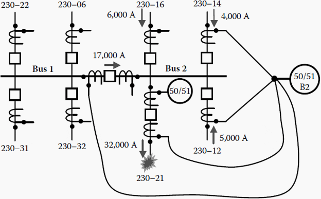 For a close-in fault on the 230-21 line, the assumption is that busside CTs (connected to line relays) operate as designed, but that the line-side CTs (connected to the bus differential relay) saturate and that overcurrent bus differential relays must be coordinated with the line relaying.